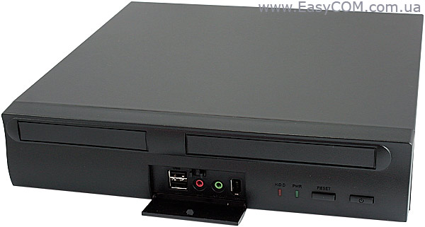 Передняя панель сделана из пластика и очень хорошо подогнана к остальному корпусу. На ее торце находятся кнопки включения/выключения компьютера и перезагрузки компьютера. Рядом расположились два светодиода: красный - служит индикатором активности жесткого диска, а зеленый - подключения компьютера к электросети. На наш взгляд, зеленый светодиод уместнее было бы сделать индикатором работы системы. Да и постоянно светящийся светодиод, даже в выключенном состоянии компьютера, не всем придется по душе, особенно в темное время суток.