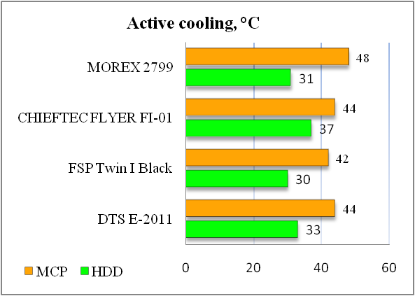Тестирование нагрева комплектующих мы проводили в двух режимах: при пассивном охлаждении (график Passive cooling) – вентилятор с радиатора материнской платы был снят; при активном охлаждении (график Active cooling) – вентилятор был установлен.